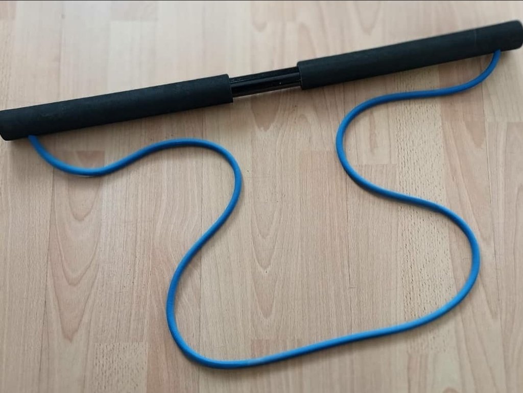 Barra multifuncional de plástico reforzado, con agarres acolchonados y banda elástica maciza incorporada.